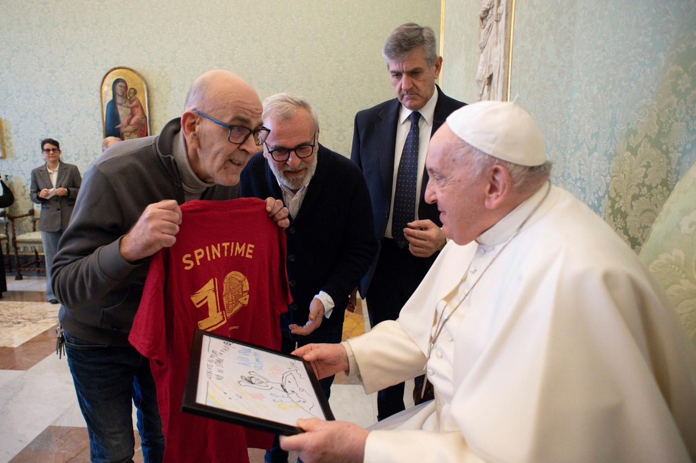 Papa Francesco con Paolo Perrini, di Action, il movimento romano di lotta per il diritto alla casa e tra i fondatori di Spintime
