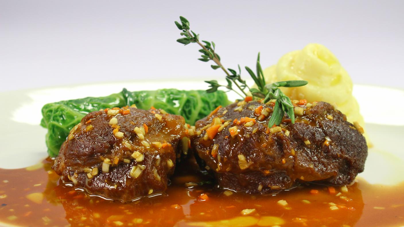Per comporre il piatto: servire le guancette ben nappate con la loro salsa e accompagnare con 1 involtino di verza e qualche ciuffo di purè di patate.