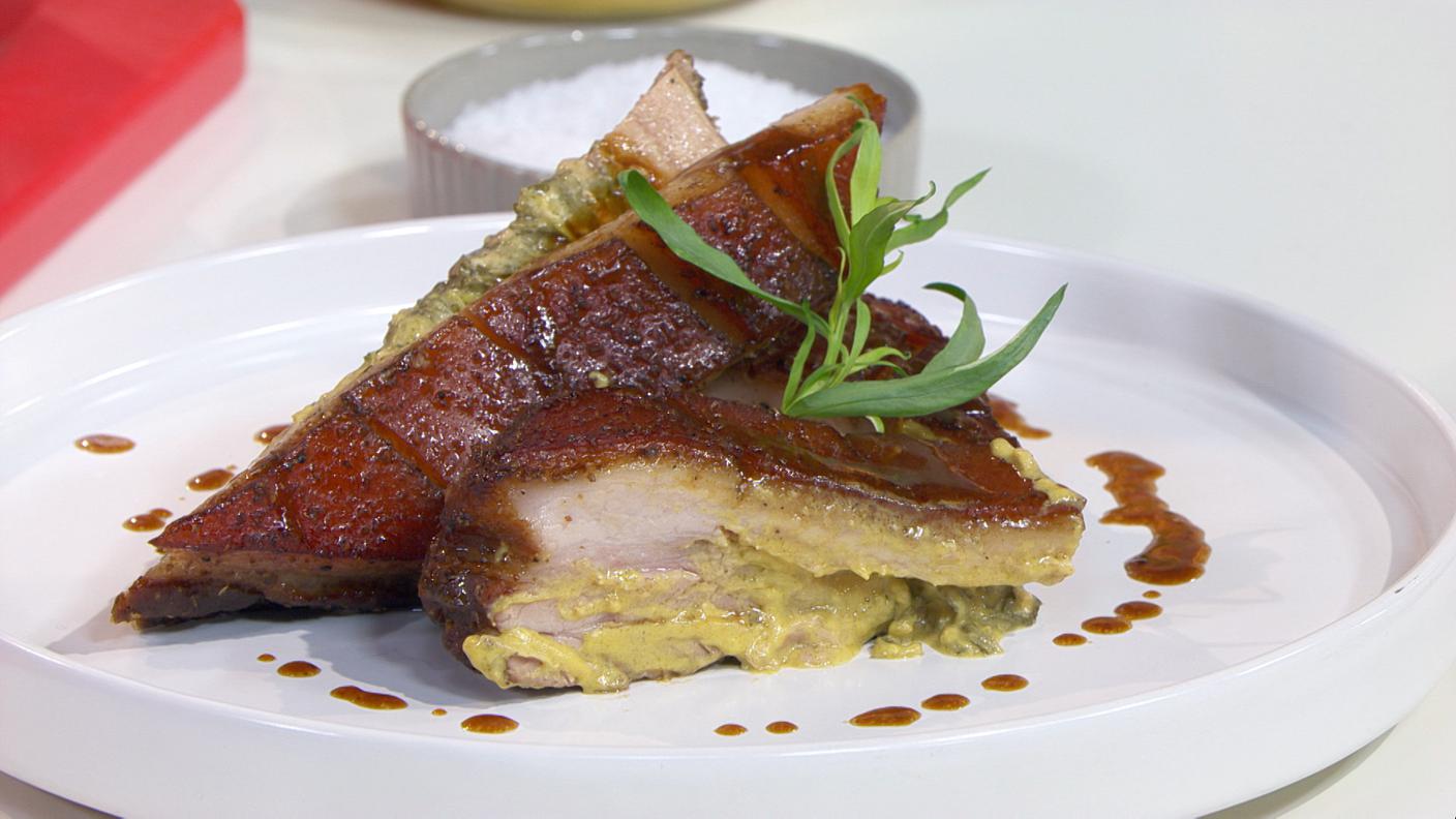 Sfornare la pancetta di maiale e lasciarla riposare per 10-15 minuti, quindi tagliarla a fette spesse e servirla con patate al forno o verdure a piacere gratinate