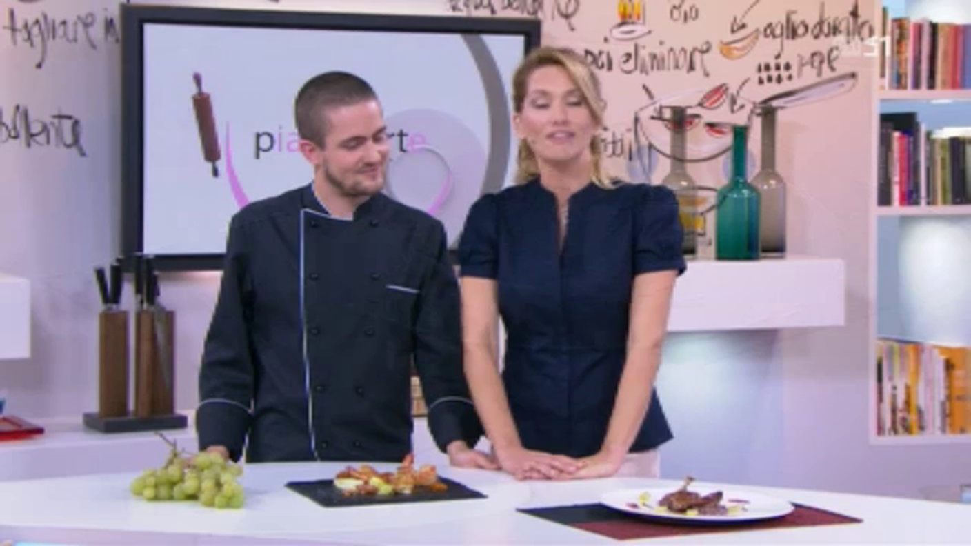 Per la preparazione dei petti di piccione: in una padella antiaderente rosolare bene 8 petti di piccione con 0,1 dl di olio di semi di girasole. Insaporire con il sale, disporli sopra una griglia e passarli in forno a 80°C per 10-15 minuti. Trascorso il tempo, spegnere il forno, aprire leggermente lo sportello e lasciarvi riposare i petti di piccione al caldo. Per la preparazione del risotto al vino: in un pentolino ridurre 3 dl di vino rosso con 10 g di zucchero fino a circa ½ dl. Intanto, in una pentola rosolare velocemente 1 cipolla rossa tritata con 0,1 dl di olio extravergine di oliva, quindi aggiungere 250 g di riso carnaroli e tostarlo molto lentamente a fuoco moderato per almeno 5 minuti. A questo punto, alzare la fiamma e deglassare con 1 dl di vino rosso restante, lasciar evaporare e iniziare ad aggiungere qualche mestolo di brodo di pollo. Dopo circa 5 minuti di cottura incorporare la riduzione di vino rosso e terminare la cottura continuando ad aggiungere poco per volta 1 l di brodo di pollo. Allontanare dal fuoco e lasciar riposare qualche secondo. Infine, mantecare con 30 g di burro e 40-50 g di parmigiano. Per la preparazione dell’uva al burro: tagliare in due 16 acini di uva bianca e togliervi i semi se presenti. In un pentolino scaldare 30 g di burro e aggiungere l’uva con un pizzico di zucchero. Saltare per 30-40 secondi a fuoco vivo. Per comporre il piatto: servire il risotto in una fondina e adagiarvi 2 petti di piccione. Terminare il piatto distribuendo in maniera irregolare l’uva al burro su ciascun piatto.