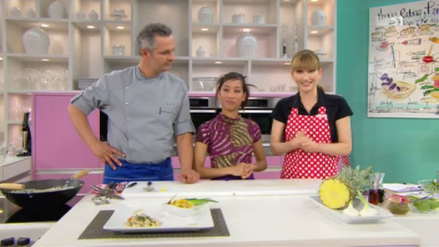 Per la preparazione del Som Tam: in un mortaio schiacciare 1 spicchio d’aglio sbucciato con 1 peperoncino rosso piccante. Unire 1 papaya thailandese sbucciata, affettata e tagliata a listarelle e 8 pomodori cherry dimezzati. Pestare bene il tutto, unire 40 g di zucchero in pasta, 1 dl di salsa di pesce “Nan Pla” e il succo di ½ limone. Continuare a pestare per 3 minuti e versare in una ciotola. Per la preparazione del pollo al curry verde: mondare e tagliare a striscioline sottili 200 g di melanzane, 200 g di zucchine e 200 g di carote. Togliere le estremità a 100 g di fagiolini conservandoli interi. Sminuzzare 500 g di petto di pollo con la pelle, deporlo in una padella e rosolarlo a fuoco vivace con 0,3 dl d’olio di semi per 3 minuti. Insaporire con sale e conservare. In una padella wok portare ad ebollizione 5 dl di latte di cocco con 100 g di pasta di curry verde, unire le verdure e cuocerle a fuoco vivace per 10 minuti. Trascorso il tempo incorporare il pollo e proseguire la cottura per alcuni minuti, fin quando la salsa inizia ad addensare. Servire il pollo accompagnandolo con del riso all’ananas alla thailandese.