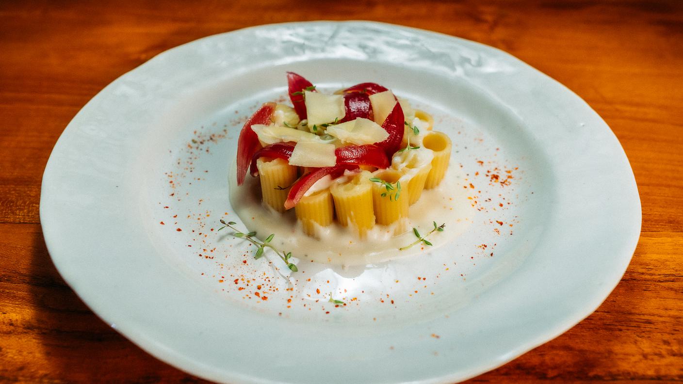 Per comporre il piatto: creare un fondo di crema, con un coppapasta disporre i maccheroni nel piatto adagiandoli sulla crema, quindi cospargere un po’ di crema di San Gottardo e finire con i petali di cipolle in agrodolce e scaglie di formaggio.