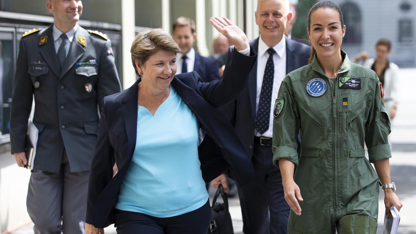 Viola Amherd si è presentata alla conferenza stampa affiancata da Fanny Chollet, la prima pilota di jet da combattimento delle forze aeree svizzere