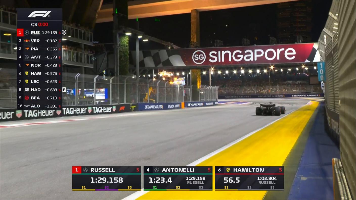 Sarà George Russell a partire dalla pole position nel GP di Singapore di domani. Il pilota britannico, già in testa dopo il primo tentativo nella Q3, ha fermato il cronometro in 1’29”158, facendo segnare il nuovo record della pista e mettendosi alle spalle Max Verstappen (+0”182). L’olandese è dal canto suo riuscito nuovamente a fare meglio delle due McLaren, con Oscar Piastri (+0”366) che partirà alle sue spalle, e Lando Norris che scatterà solo in 5a piazza, dietro anche a Kimi Antonelli. Il pilota emiliano ha così confermato il suo buon momento di forma, dopo le difficoltà riscontrate nei mesi estivi.