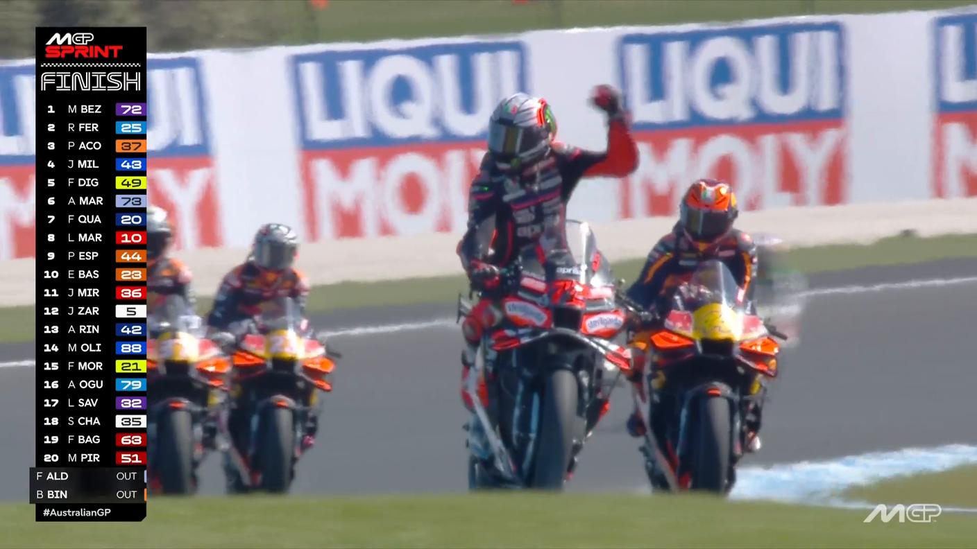 In una gara priva di Marc Marquez (infortunato) il miglior pilota della Ducati - dominatrice di questa stagione - è stato Fabio Di Giannantonio (5o) che ha preceduto Alex Marquez (6o). È invece continuato anche in Australia il brutto momento di Francesco Bagnaia: penalizzato di tre posizioni per aver ostacolato Bezzecchi in Q2, il torinese ha chiuso al penultimo posto dopo essere scattato dall’11a piazza e vanta ora solamente otto punti di margine dal vincitore di giornata per quanto riguarda la lotta al podio.